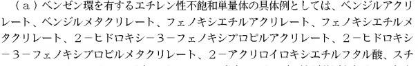 含有苯环的烯属不饱和单体的例子有:benzyl acrylate、benzyl methacrylate、phenoxyethyl acrylate、phenoxyethyl methacrylate、2-hydroxy-3-phenoxy propyl acrylate、2-hydroxy-3-phenoxy propyl methacrylate、2-acryloyloxyethyl phthalic acid、