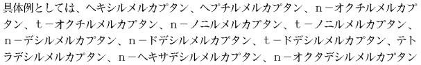 具体例子有:hexyl mercaptan、heptyl mercaptan、n-octyl mercaptan、t-octyl mercaptan、n-nonyl mercaptan、t-nonyl mercaptan、n-decyl mercaptan、n-dodecyl mercaptan、t-dodecyl mercaptan、tetradecyl mercaptan、n-hexadecyl mercaptan、n-octadecyl mercaptan |