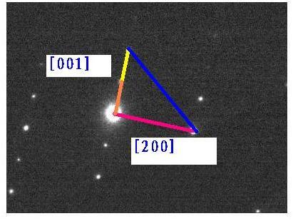 ÔÚÑÜÉäͼÉÏÕÒµ½ÁËÖ±½Ç ¿ÉÒÔÅÐ¶Ï aºÍcÖá ÓÉÓÚa ËùÒÔ1/a¶ÔÓ¦Ö±½ÇÈý½ÇÐδóÓÚ45¶ÈµÄ½Ç ËùÒÔ´óÓÚ45¶È½ÇµÄ·½Ïò¶ÔÓ¦ [100]·½Ïò ÒÀ¾Ý±ê³ß Ó¦¸Ã±ê¼Ç[200] СÓÚ45¶È½ÇµÄ·½Ïò¶ÔÓ¦ [001]·½Ïò |