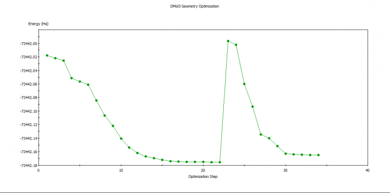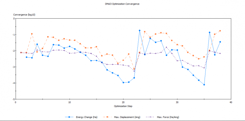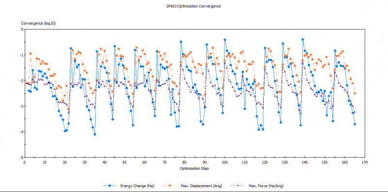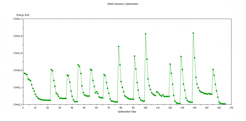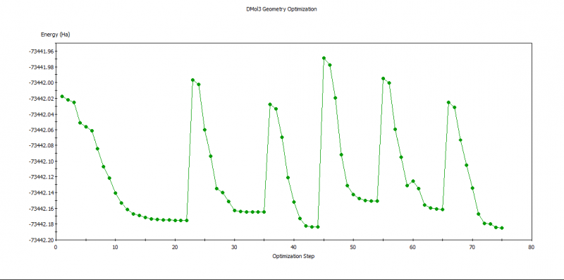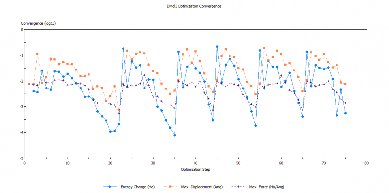 如图一所示,在用Dmol3模块进行几何优化时,一直出现能量波动的情况,请问大侠,这个情况下该怎么调参数?最有可能是什么情况导致的? 再问一个问题:看文献时发现在求出界面作用能的同时给出了范德华势能,及静电势能,请问这个是怎么查看到的? 图一 几何优化时,能量一直在波动 图二 能量波动,不能收敛 [ Last edited by caijj09 on 2012-4-11 at 21:13 ] |