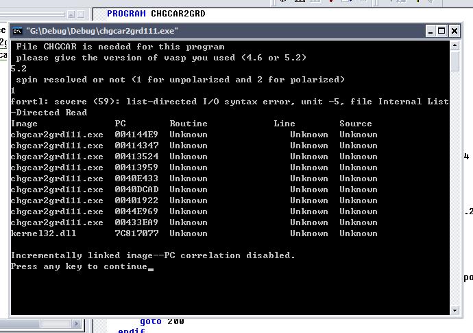 vasp计算得到的chgcar转化为ms可读文件,在小木虫上搜到的编译好的fortran源,可是在转换时发生错误,由于自己所学知识较浅,不知哪出了问题,哪位高手给指点一下?非常感谢!
