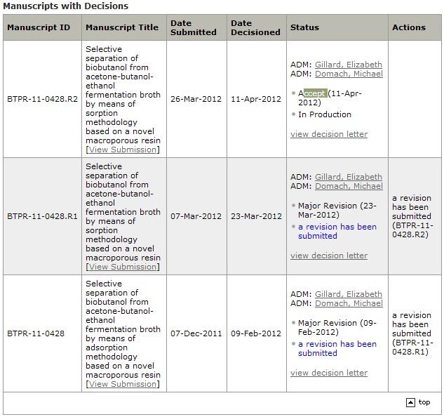 回应2012年3月8日发帖:http://muchong.com/bbs/viewthread.php?tid=4215818,该文章于2012年4月11日被正式接收,特散币411。并为在投的两篇文章祈福,求好运! Biotechnology progress 这个杂志投稿经验交流的比较少,所以自己将这篇文章的投稿经历与各位虫友分享下,也请大家指点。谢谢! 从2011年12月7日投稿,2012年2月9日大修,2012年3月7日修回稿件,2012年2月23日大修,2012年4月11日接收。整个过程还是比较漫长的,审稿流程比较复杂,一审接近两个月,under review 很快,但是到了副主编、主编那就非常慢(一般是16天)。第一次修改意见返回审稿人手里,审稿人没有意见后,编辑又对文章的语言进行了修改,然后提出了些小意见,需要你解释。 总体感觉该杂志的审稿人和编辑都很负责任,特别要感谢Gillard, Elizabeth副主编在第二次修改过程中对整篇文章语言的修改。 PS:由于该杂志的文章审稿周期比较长,建议时间比较充裕的人可以投稿试试。 最后祝各位虫友开心科研,微笑生活,身体健康! 文章投稿——修改——接收全过程 [ 来自科研家族 英乐盒 ] [ Last edited by larby9290 on 2012-4-12 at 09:28 ] |
