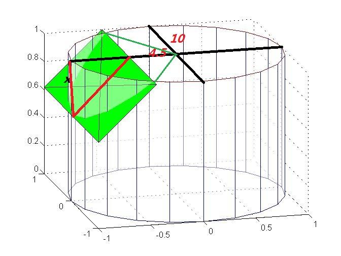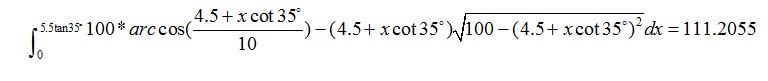这个用微积分就可以算出来, 将高度作为x,弓形面积表示为x的函数,然后对体积微元积分 quad(@(x)100*acos((4.5+x*cot(a))/10)-(4.5+x*cot(a)).*sqrt(100-(4.5+x*cot(a)).^2),0,5.5*tan(a)) ans = 111.2055 |