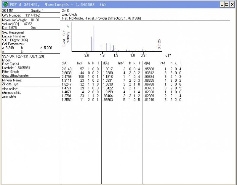 | 请问谁有六方纤锌矿的标准XRD,可否分享一下,我只知道卡号是JCPDS card no. 36-1451,不知道上哪找 |