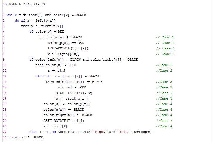 伪代码如下,见图1,图2 删除的结点是z,我的疑问是RB-DELETE-FIXUP(T, x)中的x到底指向什么,请懂的人就下面一个图给我解释下就行了。我自己是越看越晕。根据这个博客http://blog.csdn.net/v_JULY_v/article/details/6284050 下面这个图是属于case1的。但是我觉得x指向第一幅图的right[13],然后再往下看RB-DELETE-FIXUP(T, x)就不对劲了。 下面是删除结点12,图3是原图,图4是删除后的图,就这两个图和伪代码给我解释下好了,主要是解释x,y在RB-DELETE(T, z)和RB-DELETE-FIXUP(T, x)分别指向哪个结点 图1 图2 图3 图4 [ 来自科研家族 哲学人生 ] |