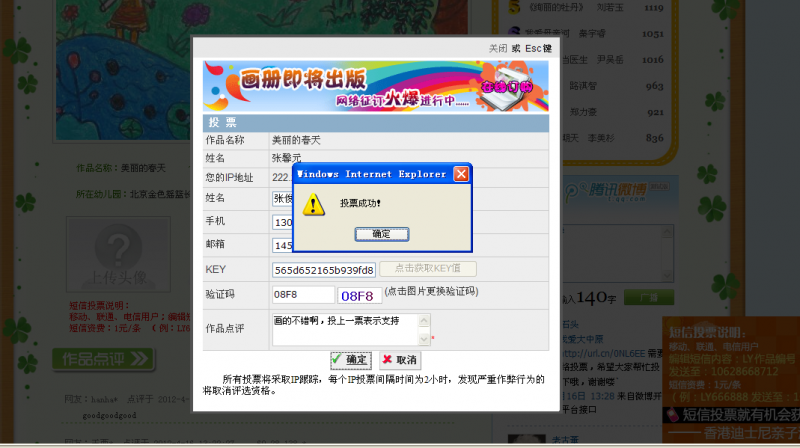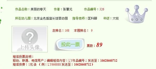 5岁的小外甥女参加绘画比赛,希望虫友多多支持。 链接:http://dzy.hnyoyo.cn/detail_toupiao.aspx?id=326 投票时候,名字和手机号可以随便编个,不需要手机验证的。 投票完毕后,报下投票后的票数,我手动发BB。 被投票的小朋友叫张馨元。 [ Last edited by mcse22 on 2012-4-16 at 13:02 ] |