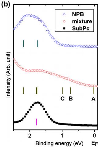 感谢楼上的老兄,建议很好。 对两种有机物分别而言,通过计算单个有机物的态密度,可以知道哪些地方有轨道,上图中最上面和最下面的单竖线和曲线是高斯计算得到的轨道和画出的相应的态密度,从图上可以看出,在费米能级到1.8eV没有能级(对单个的SubPc和NPB而言). 实际问题中,两种有机分子同时在高真空下蒸发沉积,然后测定光电子能谱,这时候需要通过计算看看那哪些地方有新的轨道出现(光电子能谱和轨道应该是有很好的吻合)。上图中中间的曲线和bar,就是一起计算SubPc和NPB后的轨道和态密度,计算后发现,相对于单个分子,在费米能级到1eV之间出现了ABC三个新轨道,同时实验中光电子能谱也有峰出现,而对单个的SubPc和NPB的光电子能谱,在0到1.8 之间是没有能级的。 请教如何建模比较合适,比如放置两个分子时的距离,取向等以什么标准来衡量,然后让他们计算 感谢帮助!!!! [ Last edited by zhurl123 on 2012-4-18 at 09:26 ] |