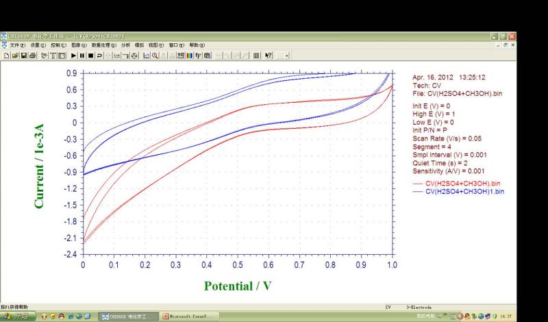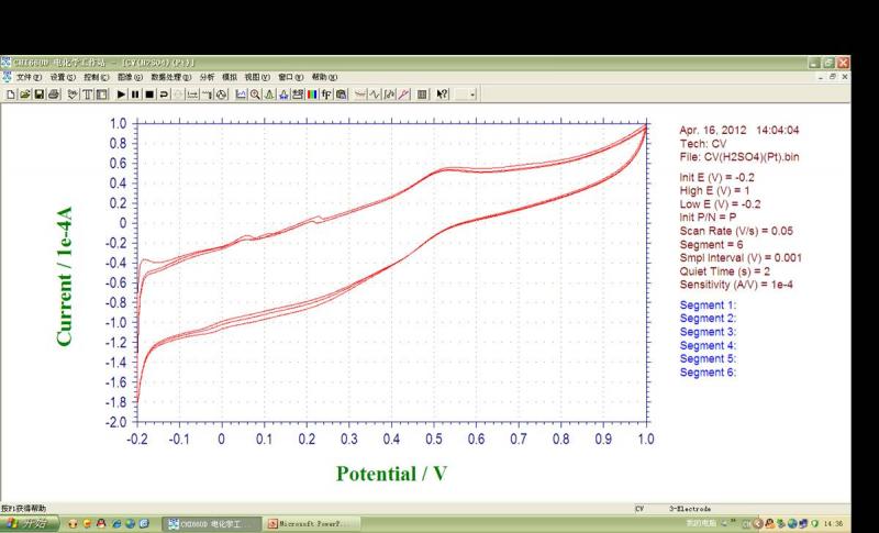 但是我在0.5 M H2SO4本底溶液中扫出的CV(循环伏安)没有出现氢的吸附/脱附峰,在在0.5 M H2SO4+1.0 M CH3OH溶液中的CVs也没有氧化峰出现,