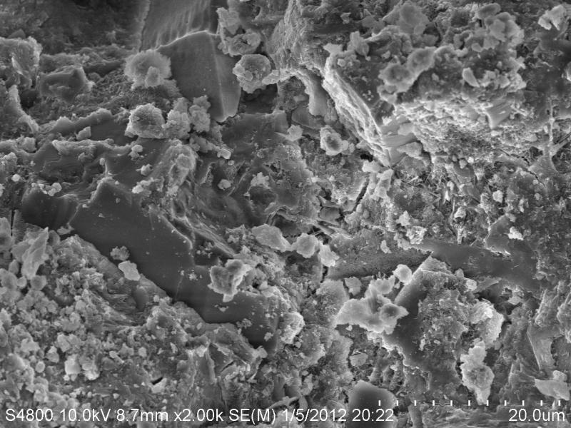 28d的?第一张:水化产物结构致密,界面较好。第二张:生成较多的片状物质,尺寸为1um左右。有EDS就好了,个人猜测是孔隙中生长的AFm