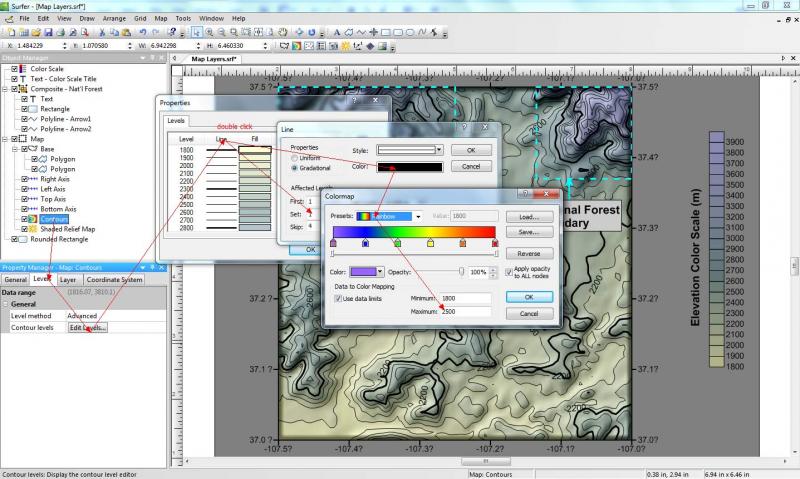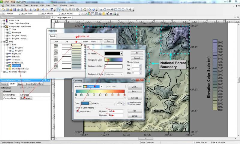 | 用global mapper导出surfer可识别的文件,继续作图。现在遇到的问题是关于不同高度代表颜色的问题,是不是自己随意选择不同颜色代表不同高度,网上也没找到所谓的lvl文件,不知大家在作图过程中又遇到类似的问题吗? |