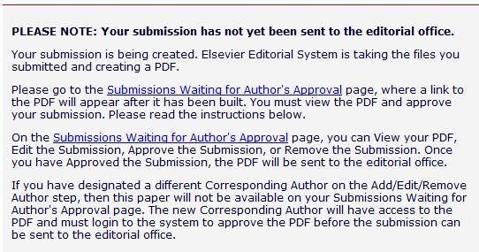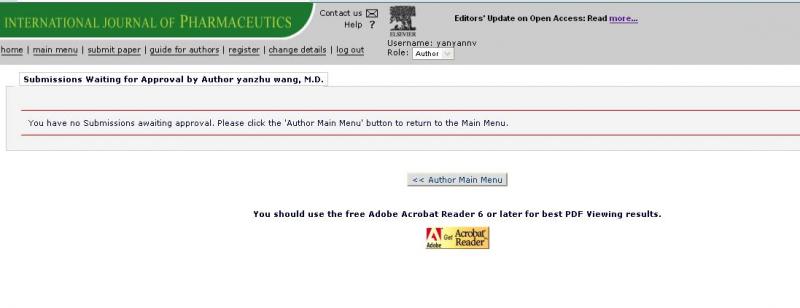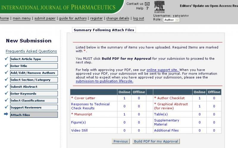 有没有最近正在投稿International Journal of Pharmaceutics 的虫友? 我遇到了一个棘手的问题。每次我按正确的步骤将所有文件上传后,生成PDF文件,然后系统让我去确认PDF文件,可是最后却告诉我没有我要确认的上传文件。我试了无数次都是这样。恳求经验人士指导,或者有类似经验的同学交流一下。 ![]() 被拒并不可怕,传不上去才是最大的悲剧啊! ![]() 完成上传 确认PDF 最后的悲剧 |