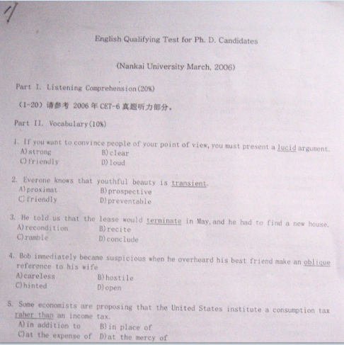 【资源】求哪位朋友能给我南开大学历年考博英语真题及答案