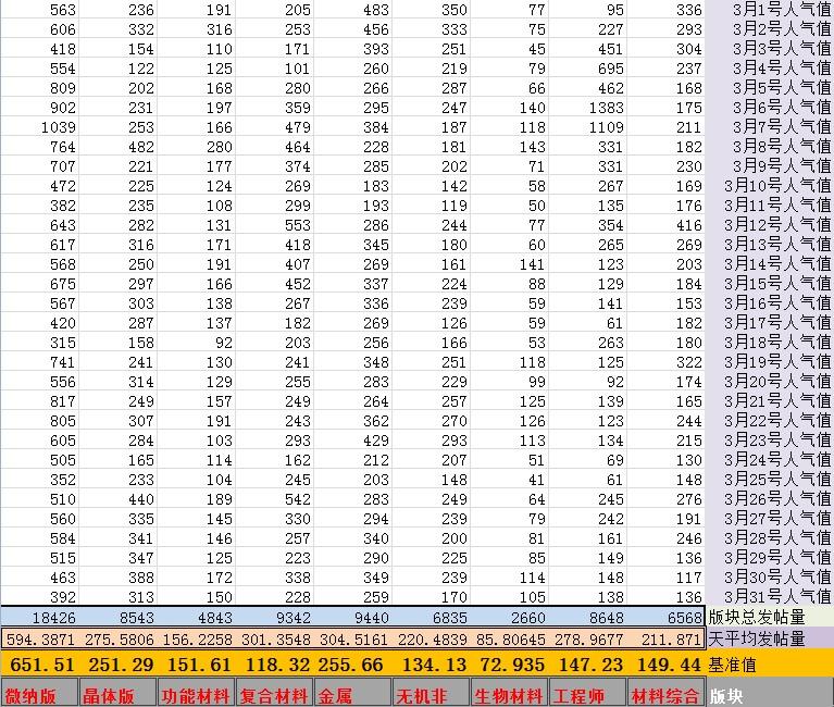 材料区以2011年第四季度平均发帖量为基准 【颁发标准】 版主管理记录低于120的,不予奖励(实习版主管理记录按每天4个管理记录折算); 如果版块本月每天平均发帖量比上一月每天平均发帖量低,该版所有版主也不予奖励。 人气值每高于标准一天每位斑竹奖励10BB+0.001VIP 奖励最高上限为200BB+0.02VIP 人气数据 具体请见:https://muchong.com/bbs/viewthread.php?tid=4409112&page=1#pid1 [ Last edited by shecf on 2012-4-19 at 21:29 ] |