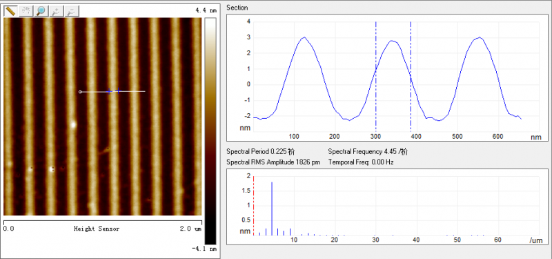 大家好,最近使用AFM测量光栅,想用Nanoscope Analysis读取光栅结构的的半高宽(Full width at half maxium),请问这个软件怎么精确读取呢?非常感谢。 图片见附件。非常感谢各位大神。 左侧为光栅结构,右侧为section line的高度图,现在就是想读取高度曲线的FWHM。 左侧为光栅结构,右侧为section line的高度图 |