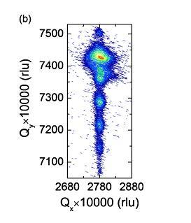 倒易空间扫描基本是对薄膜的高分辨XRD 其中倒易空间的定义可见一般的固体物理书 1. 1 RLU = 1ㄢ = 2(sin θ)/λ 2. 坐标*10000,应该没实际的物理含义,只是一个坐标变换 3. 选择非对称衍射105面: 这个薄膜应该是001面的,对称衍射00L面只能反映c方向的晶格常数的变化,如果想看衬底与薄膜之间的应力变化,需要的是a方向的晶格常数的变化,所以需要选择一个与a方向有关的面,105是常选的,其他的103,如果是立方结构114面什么的也是常选的。 |