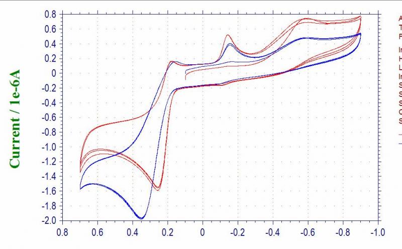 我扫一种儿茶酚胺的CV(见图),相同条件(电极、电解液、pH),最下面最大的氧化峰位置会从0.25V正移到0.4V,这是为什么啊?工作电极:玻碳;参比:Ag/AgCl;对电极:铂丝。多谢指教 [ Last edited by capricorn007 on 2012-4-23 at 20:58 ] |