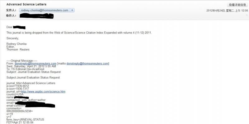 已经明确drop了。。。。。。。。还有一篇文章在上面。。。。。 另外,发现若需要实时查询某个期刊是否被检索(http://ip-science.thomsonreuters ... /jloptions.cgi?PC=D网站数据的更新的往往有很长时间延迟),最直接的方法就是通过http://ip-science.thomsonreuters.com/info/jrneval-status/查询。7天内官方必回复。 附邮件截图 之前没注意,刚才突然发现著名的罗奇疯狂在ASL的2012第一期上灌水!!!这样灌水不被踢才怪!!!TMD不带这样玩的。。。。 Research on E-Learning System Using Speech Emotion Recognition Luo Qi Adv. Sci. Lett. 5, 363-366 (2012) Research on Personalized Sports Commodities Recommendation Service System Qi Luo Adv. Sci. Lett. 5, 386-389 (2012) Affective Computing Model in E-Learning System Luo Qi Adv. Sci. Lett. 5, 390-393 (2012) [ Last edited by wl1167 on 2012-4-25 at 03:18 ] |