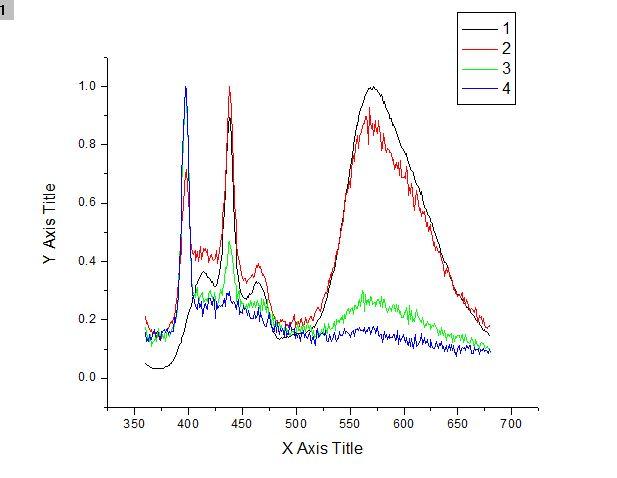 不好意思啊,做的是DDQ水的悬浮液,编号1-4悬浮液浓度越来越稀。激发波长350,扫描范围360-800.