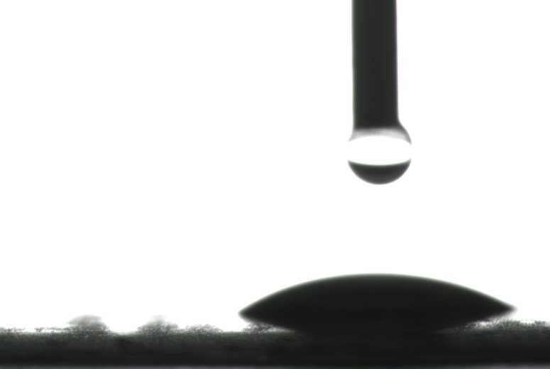 本人是做薄膜材料的,现在使用一台JC2000C1(上海中晨数字技术设备有限公司)接触角测量仪对所做薄膜进行测量,获取的图片上液滴与基底并非是完全的那么贴合,有点像小船一样的,两边上翘不与基底贴合,此时我用量角法测得。不知大家遇见这种情况都是怎么处理的?另外附上1张图片请大家指点一下。 |