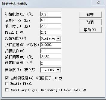 高电位4.5V 低电位2.5V,如果是正极材料,极性为positive,如果是负极材料,极性为negative.扫面速度0.1mv/s,勾上自动调节灵敏度就行了