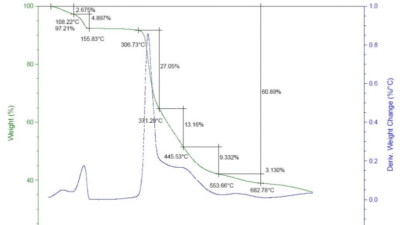 做了金属配合物[Pr2(L)6(H2O)2]•2H2O (HL = 4-Hydroxy-6-methylnicotinic acid)的热重分析,但是失重我却对不上,那位大侠帮忙分析下,具体应该怎么分析?配合物的分子式是C42H48Pr2N6O24,在线等结果,急~ 附件是txt的数据以及做测试时的老师给做出的图,麻烦各位大侠帮帮忙~ |