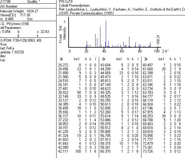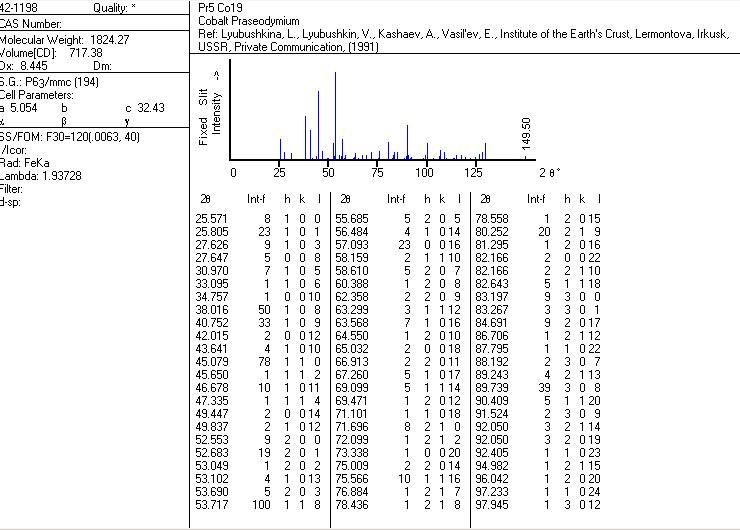 求Pr5Co19的标准晶体学数据(注:不是Ce5Co19型的,基本晶包参数为:a=5.054 ,c=32.43,z=2,就是与jade上面图谱对应的那个) 主要想要原子占位情况,之前查过文献都不太对,做出图谱和jade上的图谱对应不上,所以想求一个标准的。多谢各位高手相助! |