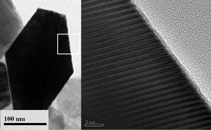 制备出一种去角的六方双锥,想把侧面的晶面指数测出来,所以方框区域做了hrtem,图只显示出一组晶格条纹,不知道能否标晶面指数?如何标?实在是不懂,求高手指点。 fft图 晶体颗粒的模型 tem和hrtem图 |