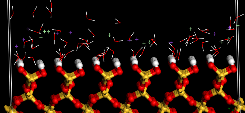 感觉是要用discovery模块跑动力学吧 1. 加离子是离子键,它们之间没有键参数,只有VDW和库仑作用。再往固体表面粘贴这些离子的时候CL和Na是分开的,粘贴前如果不赋值电荷,而在计算的时候采用力场电荷,是在能量最小化之后就查看电荷是否分别为-1和1. 2.我觉得可以从二氧化硅表面的那个Si-O-H基团的周围水的RDF分布,以及它们周围氢键的分析,比如HB平均个数,时间自相关函数等来查看盐对润湿性的影响。这种影响可能是由于离子与Si-o-h结合改变水合作用引起。 3.是用分析工具里的concentration profiles来做的。如果计算格子不是立方格子,好像需要forcite的分析工具才可以算。 |