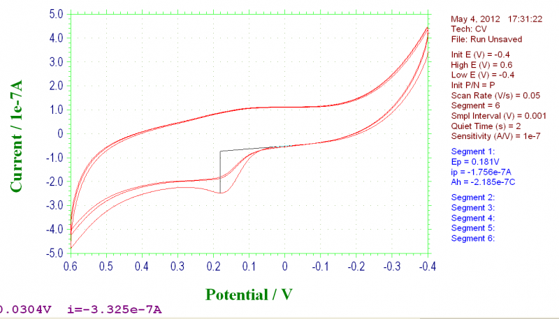 这是我做的槲皮素的循环伏安图,这应该是一个可逆的氧化还原反应,但是扫的图里只有一个峰,另一个峰不出来,并且峰电流很小,求高手解答下。谢谢!