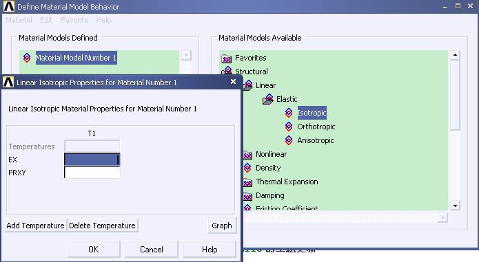 教程里说 Main Menu: Preprocessor -> Material Props -> Constant-Isotropic... 1. OK (将材料号设定为 1) 2. 在 “Young’s Modulus EX” 下输入:30e6单击OK。 可我的ansys 8.1 Material Props里没有Constant-Isotropic这一项啊。。请问该如何设置Young's Modulus? |