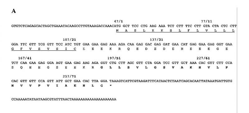 最近写论文,要用Vector NTI 11.5.1,但说明书是英文的,时间短,看不完呀,我是想做一个图,上面是cDNA序列,下面对应的是翻译的蛋白序列,哪位同学知道呢?急用呀 感激不尽! ![]() cDNA序列及蛋白图 |