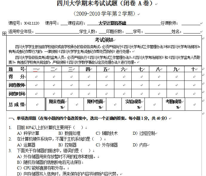 【试卷资源】四川大学计算机基础试卷