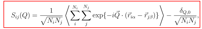 请问,在求Ashcroft–Langreth偏结构因子时,利用下图的公式,其中的虚数部分怎么处理呢?S11和S22都不会出现虚部,而S12则按照公式会有虚部,我是应该只取实部还是取模呢?或是这个虚部是不是自动为零了(对于中心对称的晶体应该是的,可是对于液态似乎不对)? |