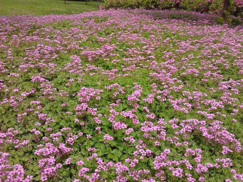 红花酢浆草,别名花花草、三叶草、夜合梅、大叶酢浆草、三夹莲、铜锤草。等酢浆草科、多年生草本植物。茎和叶含草酸。复叶、小叶三片、倒心脏形、昼开夜合。自春至秋开花,花黄色、桃红色、紫红色。