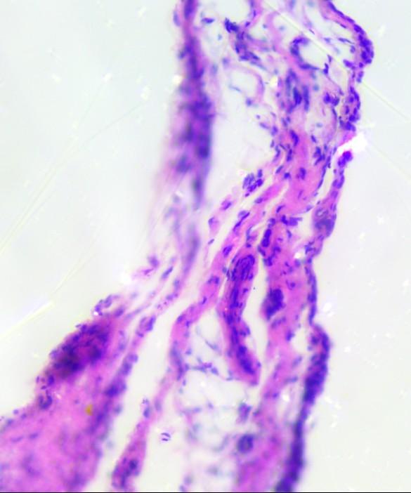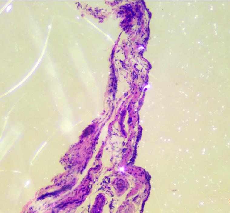 请做过大鼠滑膜病理切片的虫友帮帮忙看下这张滑膜病理切片图对不对,取的滑膜滑膜是否还沾有其他组织,摸索了好久石蜡包埋的条件才切出来,但是看不懂,请有经验的朋友帮忙分析下,谢谢!