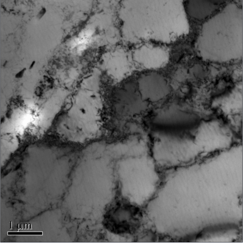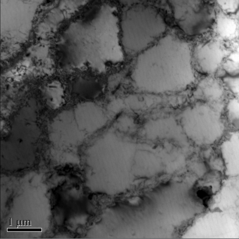 同意楼上朋友说的.. 不考虑温度的影响, 如果是冷变形的话, 由于是Al合金,那么变形下的位错构型应该是多样的,比如Tangles, forests,configuration related to second phase等。比较典型的冷挤压组织 cellular structure with dislocation cells. 加上温度的影响后,可能会发生的dynamic recovery, recrystallization and grain growth. 结合上面的组织应是第一种。 |
