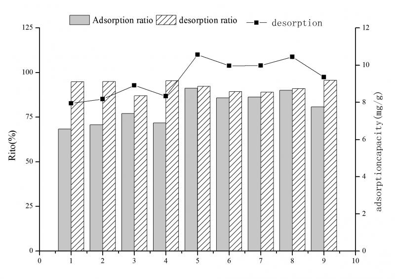 Name Adsorption ratio desorption ratio adsorptioncapacity(mg/g) 1 68.44%±0.0060 94.75%±0.0081 7.94±0.061 2 70.68%±0.0040 94.99%±0.0012 8.17±0.033 3 77.01%±0.0088 87.04%±0.017 8.91±0.089 4 71.73%±0.0097 95.47%±0.0030 8.33±0.097 5 91.14%±0.0017 92.26%±0.00071 10.56±0.017 6 85.80%±0.0080 89.31%±0.0022 9.96±0.066 7 86.27%±0.0094 89.03%±0.0045 9.98±0.094 8 90.08%±0.0077 90.98%±0.00021 10.44±0.078 9 80.8%±0.0055 95.64%±0.0028 9.35±0.045 |