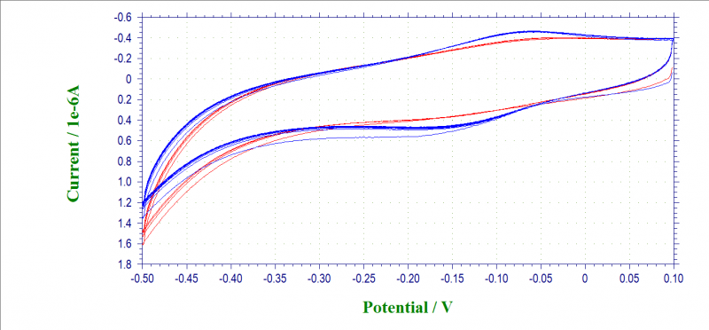 如图,it图是连续滴加分析物测得(电流是增加的),cv图一个是加入前(蓝色),一个是加入后的(红色),为什么这两个图的结果不一致呢?求大神指导~~