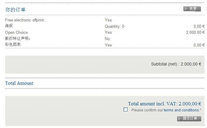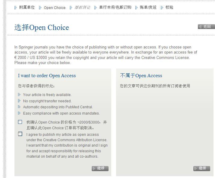 我最近有篇文章被接收了,杂志属于Springer Link 系统中的期刊。我现在对Springer Link 系统要求回答的问题弄糊涂了,想请有在Springer Link 系统发表过文章的人帮我回答下,十分感谢。 好像系统要求我必须选择左侧“I want to order Open Access”下的两个选项。 我选择之后,最后该系统出现了费用 2000欧元,但是我不太愿意出这一费用。 请问我该如何选择呢?十分期待大家的帮助。 [ 来自科研家族 生物医药家族 ] |