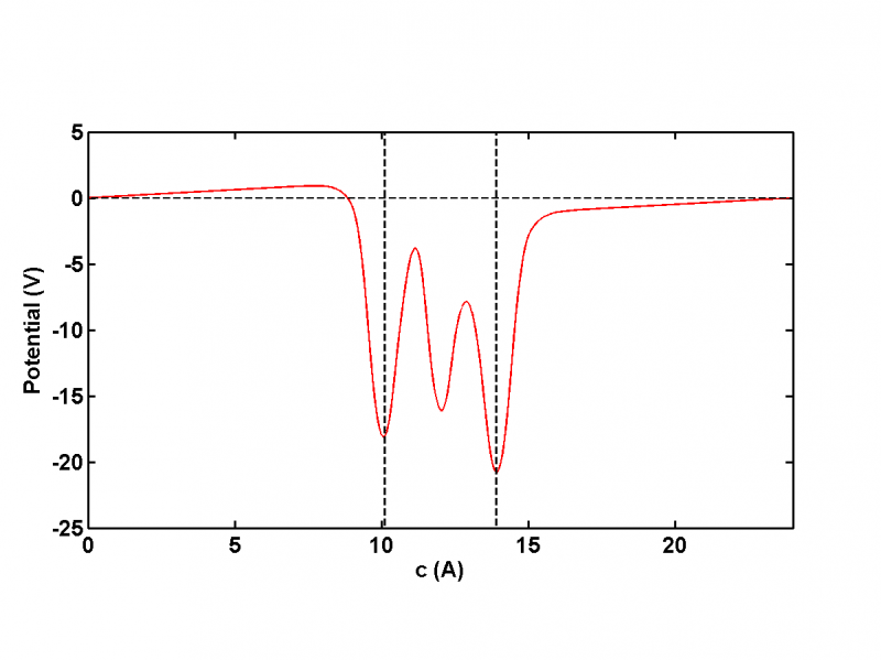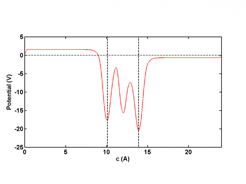 我试着计算了一个铁电薄膜在真空中的电势分布,模型如下: 不加偶极修正,电势分布: 加了偶极修正,电势分布: 看着似乎偶极修正起到了应有的效果,但是问题是,PTO薄膜中,极化是向右的,那么右边真空层的电势应该高于左边,但为什么计算的结果是反的? |