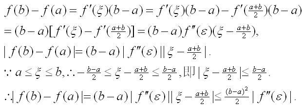 要证明的结果中应该是(b-a)^2,不是(b-a)^4.例如对函数y=x^3在闭区间[-1/8,1/8]上满足二次可微,且f'(0)=0.由计算(2/(b-a)^4)*|f(b)-f(a)|=2,但f''(x)=6x在此区间上的最大值为4/3<2,即结论不成立.