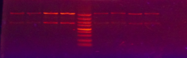 似乎marker中最亮的带是100ng 其余50ng 7000的质粒切成2000+5000不切开还能再亮一些 有人能从这幅图里确切的看出质粒的浓度吗?