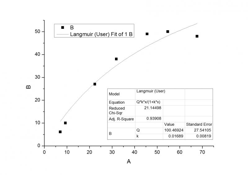楼主拟合的结果不好,我根据楼主的数据作图拟合了一下,结果如下: Model Langmuir (User) Equation Q*k*x/(1+k*x) Reduced Chi-Sqr 21.14498 Adj. R-Square 0.93908 Value Standard Error B Q 100.46924 27.54105 B k 0.01689 0.00819 楼主的问题在于没有给予Q和K恰当的初值,以至于最后的拟合结果不是收敛的而是发散的。 |