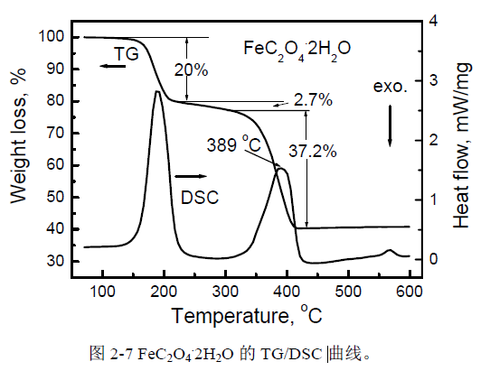 你好!我没见过4个结晶水的,一般都是2个结晶水的,下面是两个结晶水的草酸亚铁的热重曲线; 在TG 曲线上,220 °C 以前的失重为20.0 %,与失水反应的理论值(20.0 %)完全相同;从220 °C 到300 °C,重量损失很小,只有2.7 %,这部分失重应该来自FeC2O4 分解,在300-420 °C 的温度范围内,失重为37.2 %,这两部分的失重总和与FeC2O4 分解成FeO 的失重理论值(40.0 %)相同;在420 °C 以上,没有检测到重量变化。 |