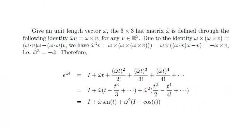 遇到一个公式推导的问题,涉及到Roderigues Formula,翻译过来是罗德里格斯公式吗,呵呵,我不知道对不对。请看附图1 其中Omega hat是反对称矩阵,推导时给的提示是把其中的奇项和偶项分别处理,应该是把其中的奇项相加,偶项相加。原文是:Collecting the odd and even terms in the above equation, we get to Roderigues Formula for a rotation matrix R. R的表达式见附图2。 可能会有缺少的参数什么的,如果有,请给我说一下。 谢谢,朋友们! [ 来自科研家族 哲学人生 ] |
