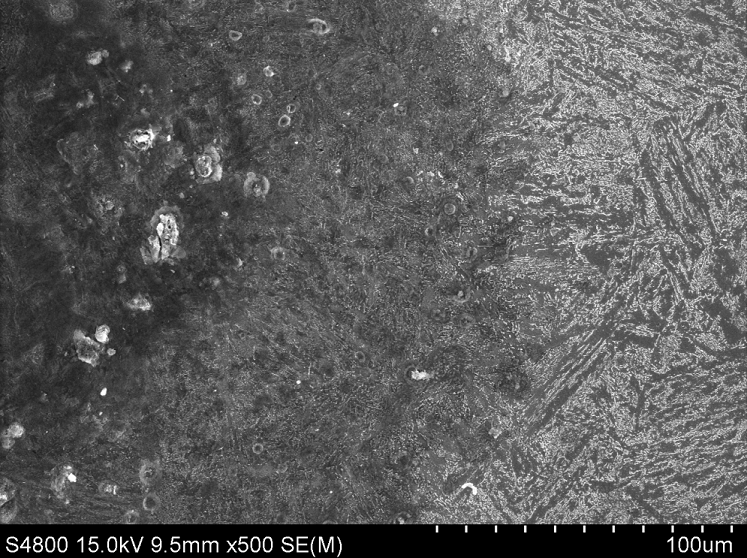 材料是40CrNiMo,做过极端条件下高温骤冷处理,左侧为处理区域,析出了颗粒状化合物,中间为热影响区,右侧仍保持为40CrNiMo。 但是很多金相组织不能辨别,查了些金相组织图谱,但是这种合金的金相没有找到,相关的论文也看不清楚组织,希望哪位能帮帮忙鉴别下,到底各区域生成了什么相,谢谢了…… 500倍 金相 |