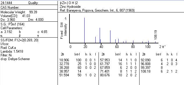 哪位大侠有Zn(OH)2 的XRD标准图谱,谢谢。