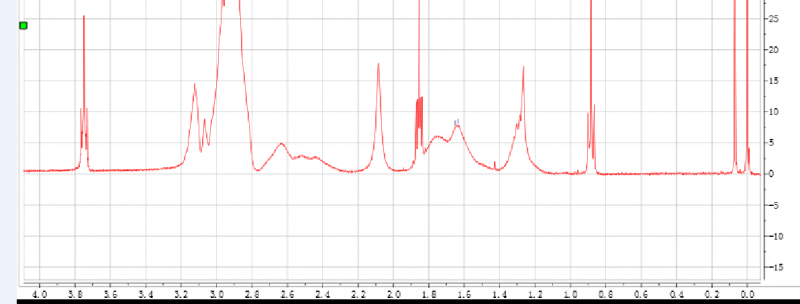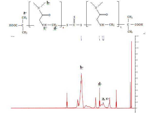 这张图里我标出了四个要分析的地方,但是其余的杂峰不知道到底是什么? δ=2.91处的一组峰为-N(CH3)2氢质子峰,δ=1.86和δ=1.63处分别为N,N-二甲基丙烯酰胺重复单元中亚甲基和次甲基的氢质子峰,在δ=1.66处为偕二甲基中甲基的氢质子峰。 其余的不知道是什么,各位高人帮帮忙 这是已经分析了的几个位置 |