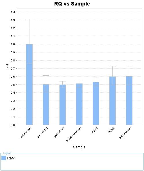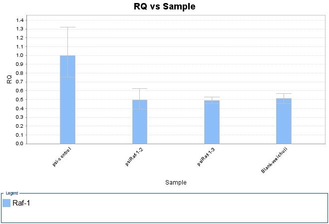 请大家看图吧,我做的是shRNA,做了两次RT了,结果基本相同。很奇怪的是我的weichuli样品(即单纯的细胞培养)的表达量理论上应该是和control一样,但为什么如此低?!!! 求帮助。。。。 这三个柱状图分别是插入打乱序列的siRNA和两条理论上有抑制效果的siRNA 又加了一个仅仅是细胞培养,命名为weichuli |