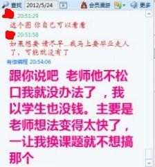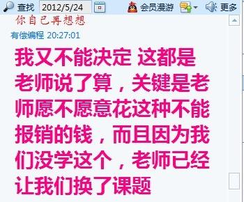 图没有发出来 起因:http://muchong.com/bbs/viewthread.php?tid=4515001 刚开始 昨天遇到疑问问她之后,她给我说了下面这些........................a 编出结果了 戏剧性的一幕出现了 请大家看看她给我说换课题之后的时候,和告诉我最近很忙的来不了实验室的时间, 如果没弄错,这个人是的骗子,应该是女的,但是注册小木虫的写的男的。 ps:我有打击报复的意思,主要是为了我这3天2夜都在想这个问题,结果却被人给耍了,最恨别人骗我。还有就是给虫友提个醒!!! [ Last edited by lijie169 on 2012-5-25 at 07:26 ] |